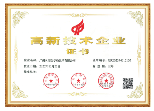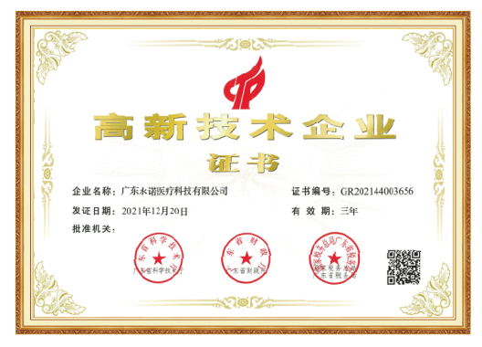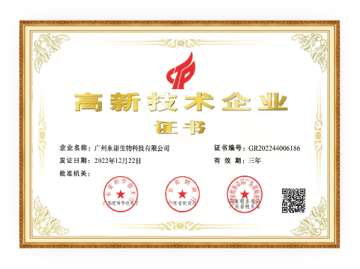 自成立以來,公司已公開申請專利66項,其中有57項已授權,廣東省名優(yōu)高新技術產品2項。憑借強大的研發(fā)實力和創(chuàng)新能力,永諾生物成功入選大灣區(qū)生物科技創(chuàng)新企業(yè)50強、國家高新技術企業(yè)、廣州市科技創(chuàng)新小巨人企業(yè)、廣東省高新技術企業(yè)培育庫入庫企業(yè)、廣州市企業(yè)研發(fā)機構等榮譽。2023年永諾生物榮登首屆廣州百家新銳企業(yè)"銳100"名單;2024年公司榮獲"廣東省專精特新中小企業(yè)"稱號。